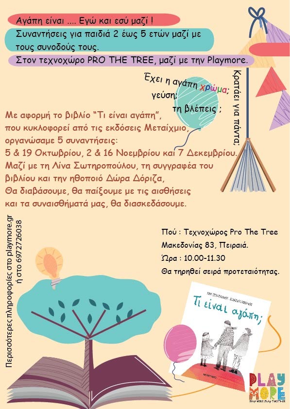 Με αφορμή το βιβλίο «ΤΙ ΕΙΝΑΙ ΑΓΑΠΗ» που κυκλοφορεί από τις εκδόσεις Μεταίχμιο, η συγγραφέας Λίνα Σωτηροπούλου και η ηθοποιός-συγγραφέας Δώρα Δόριζα δημιούργησαν ένα ειδικά διαμορφωμένο πρόγραμμα για παιδιά ηλικίας 2 έως 5 ετών και τους συνοδούς τους. Το πρόγραμμα περιλαμβάνει πέντε αυτοτελείς συναντήσεις, που όμως μαζί αποτελούν μια ολοκληρωμένη εμπειρία γύρω από την αγάπη, τα συναισθήματα και τις αισθήσεις.