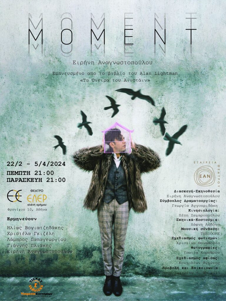 Η ομάδα ΕΑΝ παρουσιάζει το “MOMENT”, μια παράσταση με θέμα τον Χρόνο, εμπνευσμένη από το βιβλίο του Alan Lightman «Τα Όνειρα του Αϊνστάιν». Πρόκειται για ένα σύγχρονο θεατρικό έργο, με την υπογραφή της Ειρήνης Αναγνωστοπούλου, μια ιστορία για τον άνθρωπο που στέκει απέναντι στον χρόνο γεμάτος ερωτήματα.
