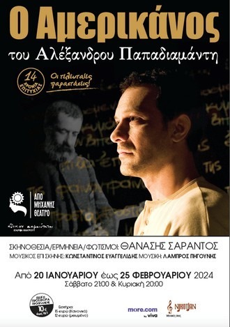 Ο «Αμερικάνος» του Αλέξανδρου Παπαδιαμάντη, σε σκηνοθεσία-ερμηνεία του Θανάση Σαράντου και μουσική Λάμπρου Πηγούνη βασίζεται στο ομώνυμο αριστουργηματικό διήγημα του Σκιαθίτη συγγραφέα. Πρόκειται για μια συναρπαστική ιστορία αγάπης και ξενιτιάς, μια ιδιαίτερη θεατρική μεταφορά για έναν ηθοποιό κι έναν μουσικό.