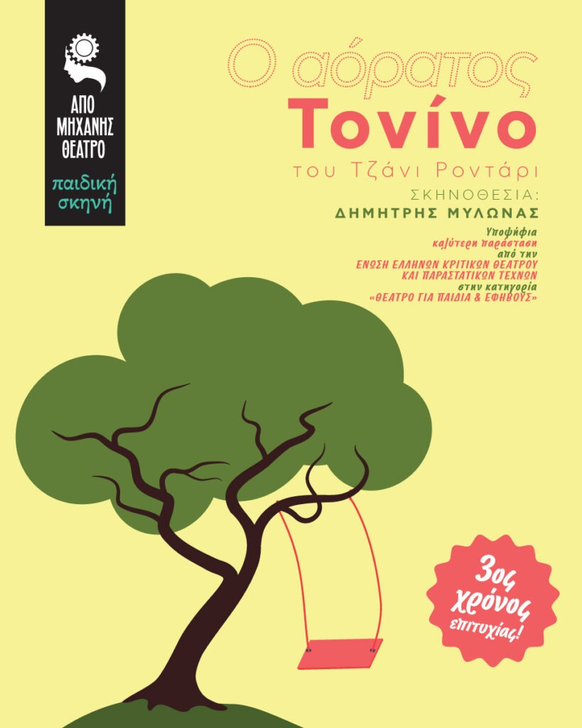 Μετά τη μεγάλη επιτυχία και τα sold-out που σημείωσε για 2 συνεχόμενες χρονιές, η ΠΑΙΔΙΚΗ ΣΚΗΝΗ του «Από Μηχανής» Θεάτρου παρουσιάζει για 3η χρονιά την παράσταση που αγαπήθηκε από μικρούς και μεγάλους «Ο αόρατος Τονίνο» βασισμένη στο ομότιτλο βιβλίο του Τζάνι Ροντάρι και σκηνοθεσία Δημήτρη Μυλωνά.