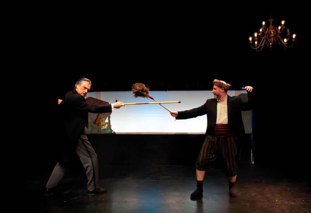 - Στην παράσταση συμμετέχει ζωντανά ο καραγκιοζοπαίχτης Κώστας Σπυρόπουλος. Βοηθοί στο μπερντέ, οι μαθητές της Ακαδημίας Θεάτρου Σκιών «Θανάσης Σπυρόπουλος».
