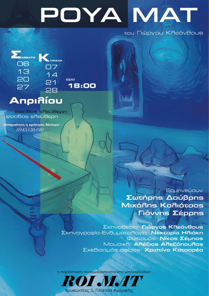 Για τέσσερα Σαββατοκύριακα του Απριλίου, το ιστορικό μπιλιαρδάδικο Roi Mat στην πλατεία Αμερικής θα μεταμορφωθεί σε θέατρο. Οι ηθοποιοί σε παίχτες και οι θαμώνες σε θεατές, χάρη στη site-specific παράσταση του Γιώργου Κλεάνθους, «ΡΟΥΑ ΜΑΤ».