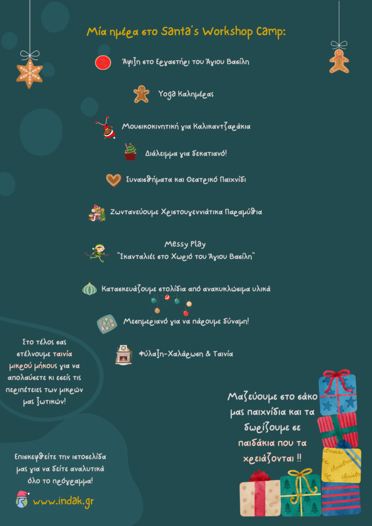 Μυρωδιά φρεσκοψημένων μπισκότων και κανέλας. Ζεστασιά από τζάκι. Αστραφτερά, πολύχρωμα λαμπάκια. Χριστουγεννιάτικες μελωδίες και ζωηρά καμπανάκια. Ζεστή σοκολάτα και μελωμένα γλυκίσματα. Όσφρηση, αφή, όραση, ακοή και γεύση επιστρατεύονται για να βιώσουν τα παιδιά με όλες τις αισθήσεις μία αξέχαστη Χριστουγεννιάτικη εμπειρία στο Santa’s Workshop Camp.